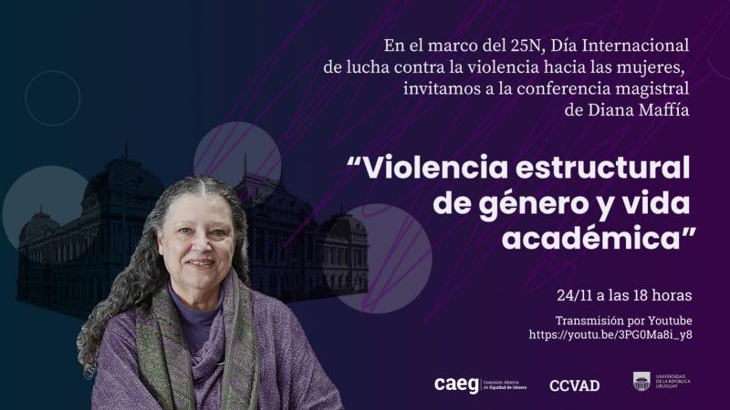 En el marco de las actividades previstas por la Comisión Abierta de Equidad de Género (CAEG) para el 25N invitamos a ver la Conferencia de Diana Maffía el día 24 de noviembre a las 18 hr. titulada "Violencia Estructural de Género y Vida Académica"